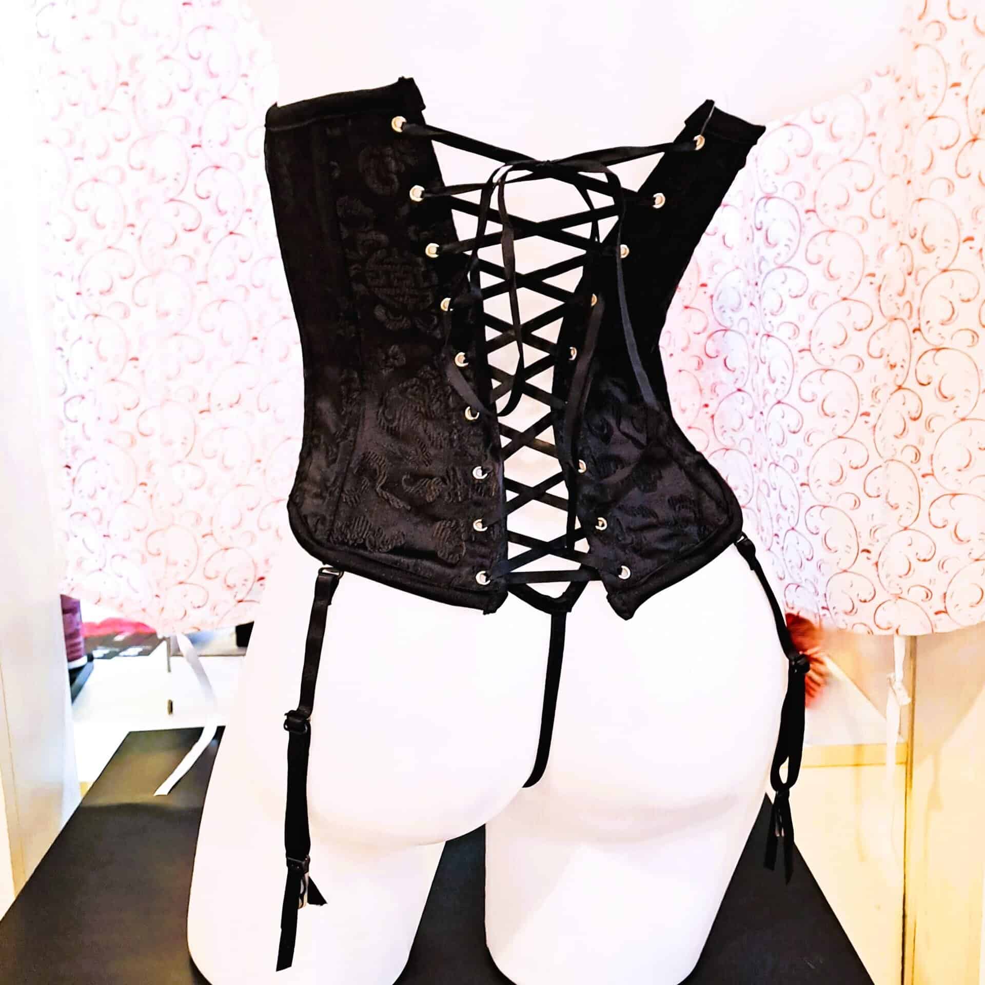 È un bustino in tessuto broccato nero di alta qualità, concepito sia come raffinata lingerie sia come capo moda versatile, perfetto per esaltare la silhouette e aggiungere un tocco di eleganza ai tuoi outfit.