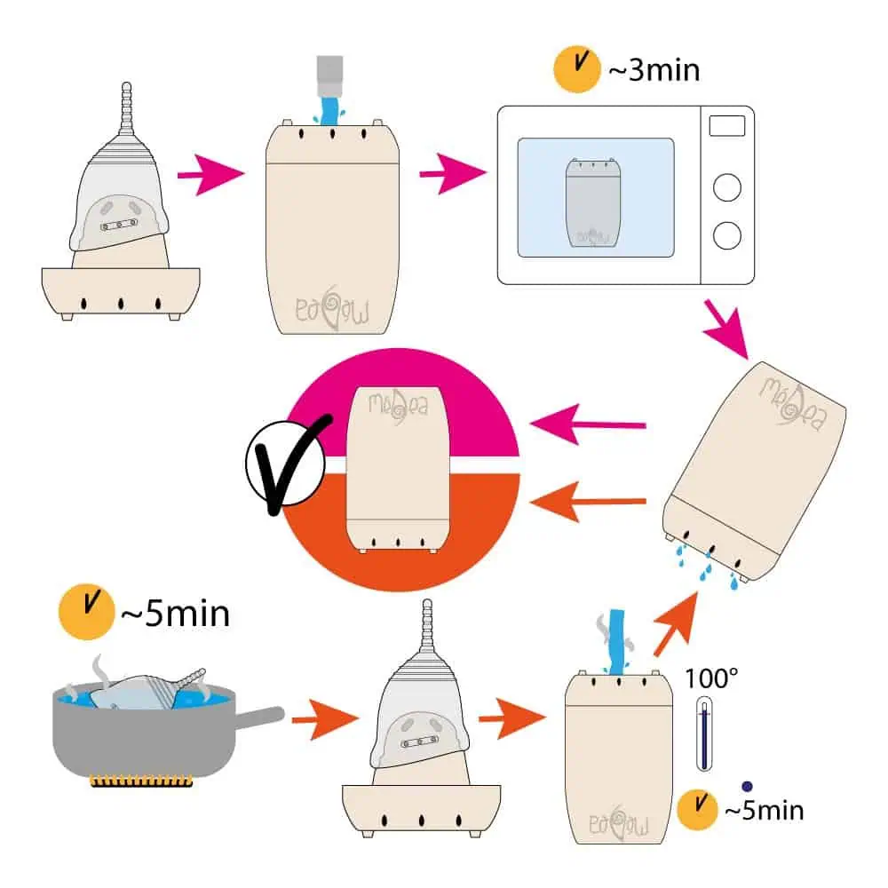 - Sterilizzazione iniziale: Prima del primo utilizzo e all’inizio di ogni ciclo, sterilizza la coppetta con lo sterilizzatore incluso per 5-7 minuti