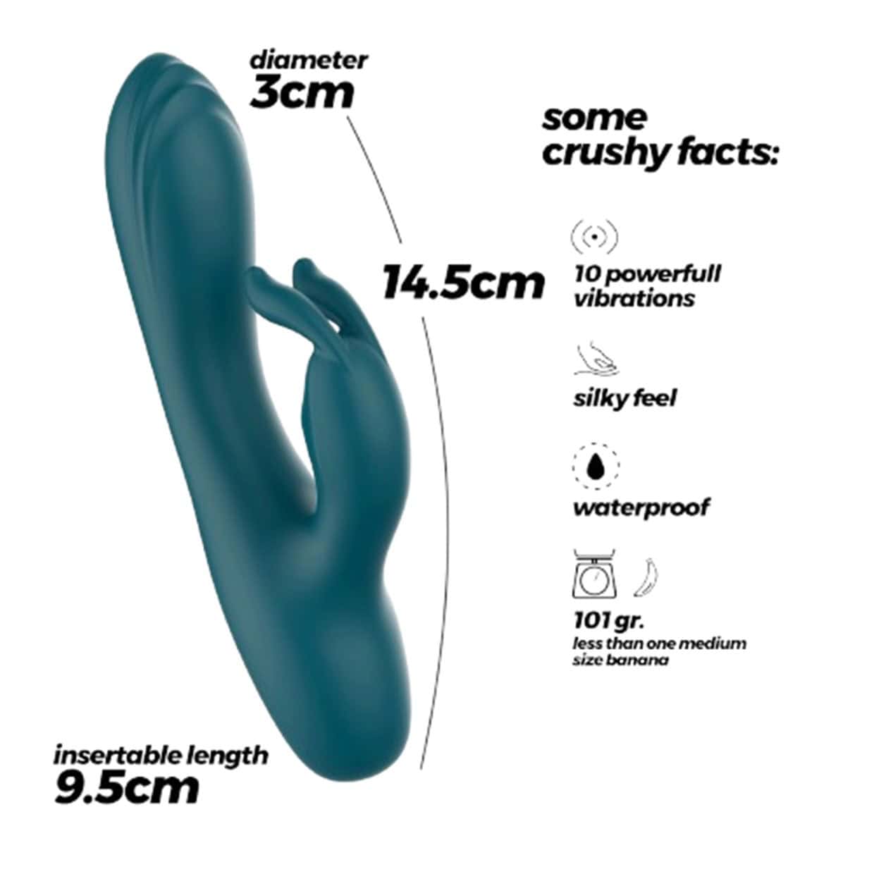 Realizzato in silicone di altissima qualità , il Mini Rabbit Lola assicura una sensazione piacevole al tatto ed è completamente resistente all’acqua, permettendo un utilizzo sicuro anche in ambienti umidi come la doccia. Le sue dimensioni – 14,5 cm di lunghezza totale con 9,5 cm di lunghezza inseribile e un diametro di 3 cm – lo rendono maneggevole e facile da riporre in modo discreto.