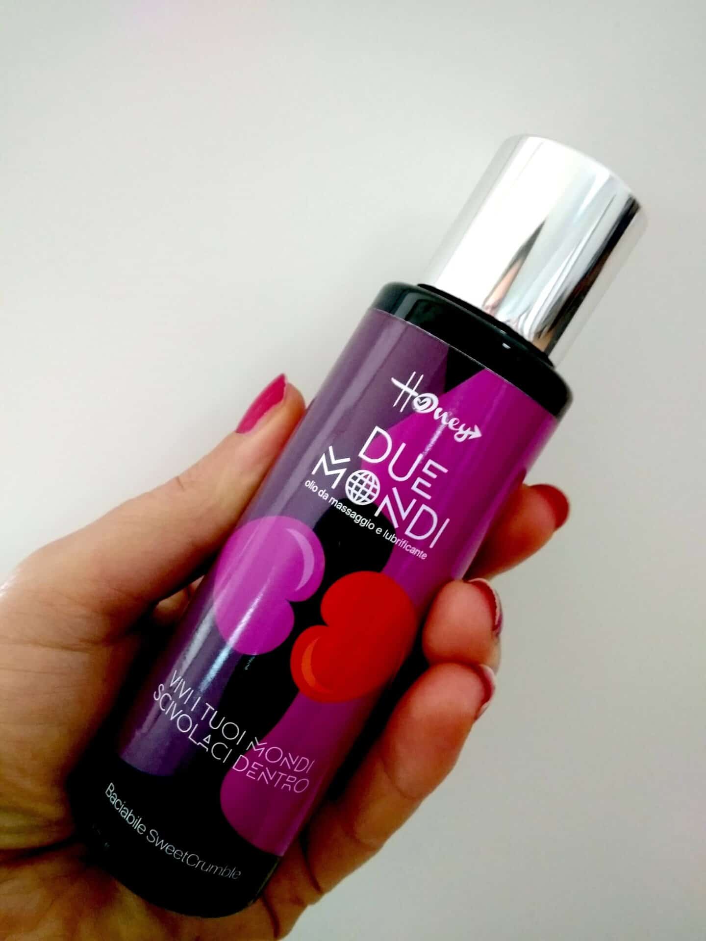 Due Mondi, un olio da massaggio e lubrificante, due in uno. Potrai coccolare completamente il corpo di chi ami senza limiti, con le mani, con le labbra o con qualunque altra cosa tu possa desiderare.