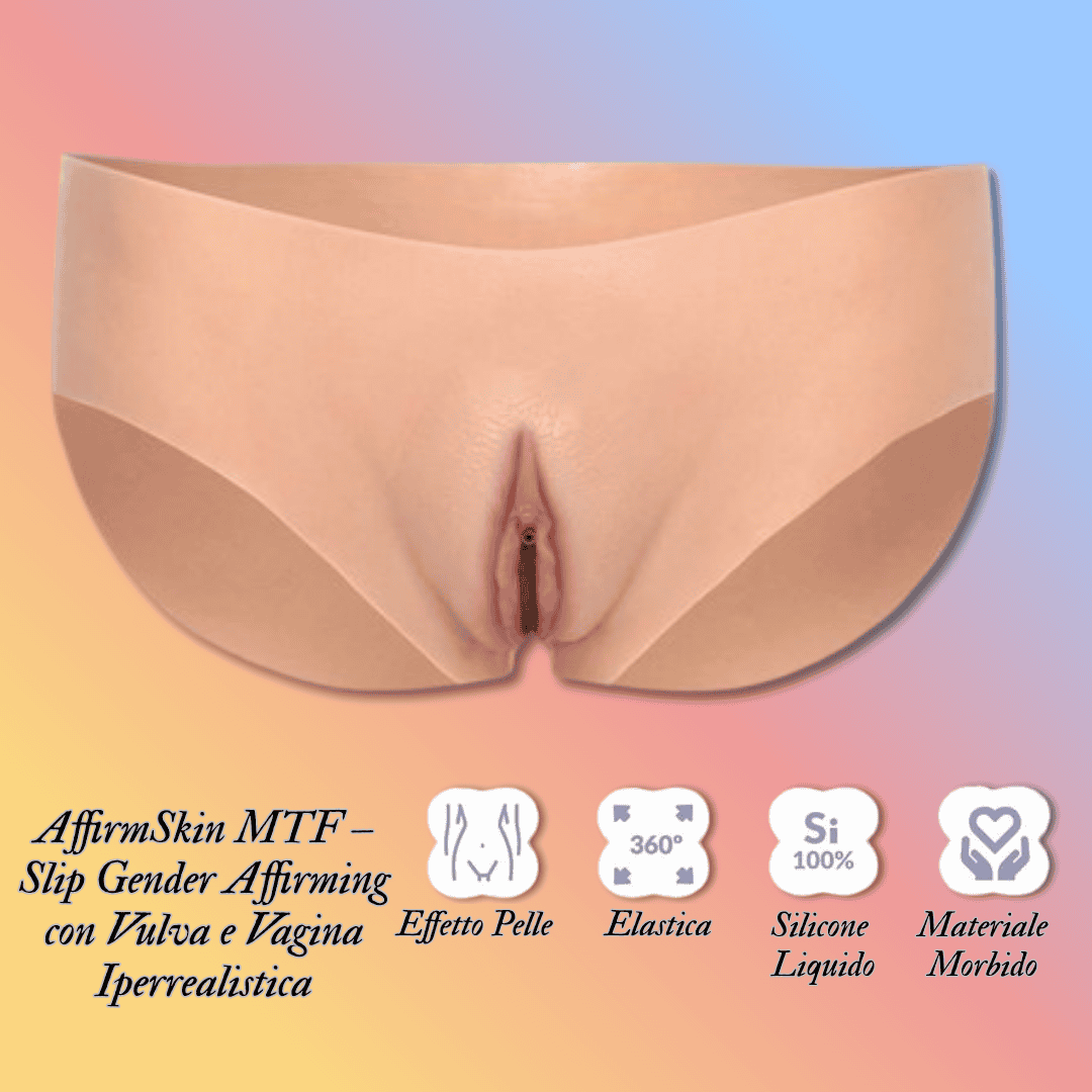 AffirmSkin MTF è uno slip gender affirming progettato per le persone in transizione Male to Female. Integra una vulva e una vagina iperrealistica in silicone medicale, offrendo un supporto concreto e rispettoso per vivere il corpo in modo più allineato alla propria identità di genere.