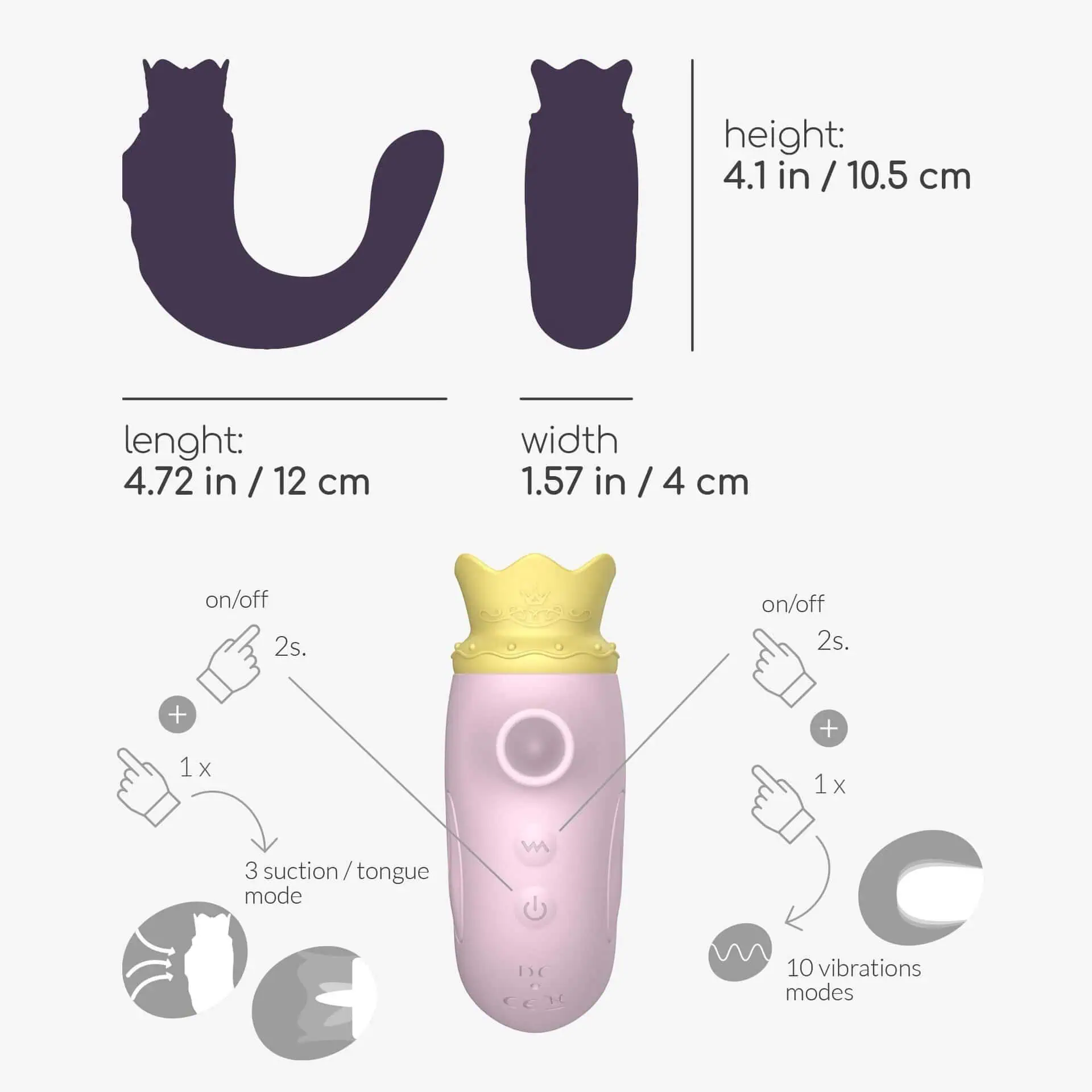 Pulisci il toy con acqua e sapone neutro o con detergente specifico prima dell’uso. Applica un lubrificante a base d’acqua sulla zona da stimolare per aumentare il comfort e l’intensità delle sensazioni. Posiziona la bocca del succhiaclitoride sulla clitoride, attiva una delle 3 modalità di aspirazione e regola l’intensità desiderata. Utilizza la lingua vibrante per stimolazioni esterne e la coda curva per il massaggio del Punto G, scegliendo tra le 10 modalità di vibrazione disponibili. Dopo l’uso, spegni, lava accuratamente, asciuga e riponi in un luogo pulito e asciutto.